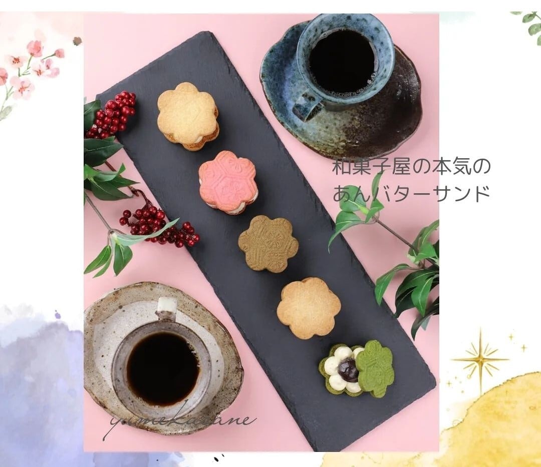 愛らしいお花の形、和柄のモダンなバターサンド。和菓子屋さんらしく餡バターを、発酵バターたっぶりのクッキーで挟んだネオ和菓子。プレーン、抹茶、ほうじ茶、苺の四色が楽しめます。
